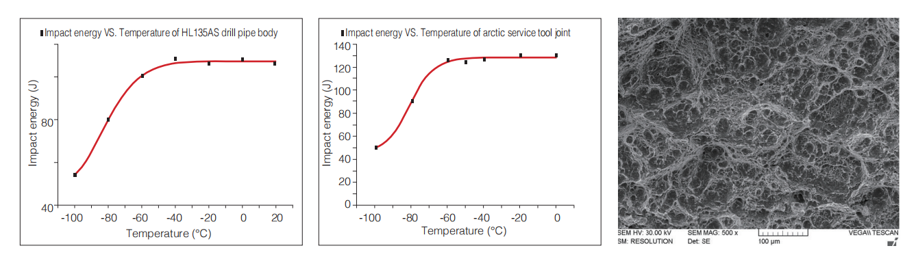 Compared to conventional API drill pipe, Hilong's proprietary Arctic Service Drill Pipe has a higher low temperature impact value and a lower brittleness transition temperature, resulting in better resistance to brittle fracture. Apparently, these arctic service products have better Fracture and fatigue resistance than normal API series if both of them are all used in room temperature, thus the service life could be improved evidently.