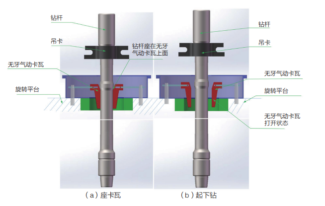海隆零卡瓦咬傷快速起下鉆鉆桿,是專門為解決起下鉆作業(yè)時卡瓦牙咬傷鉆桿本體及雙吊卡作業(yè)效率低,勞動強(qiáng)度大等問題而設(shè)計(jì)開發(fā)的一種特殊產(chǎn)品。其特點(diǎn)是在 API 普通鉆桿的基礎(chǔ)上,距內(nèi)螺紋接頭端面一定位置處增加一個抬肩。在起下鉆時,鉆柱坐在氣動卡瓦上,重力由氣動卡瓦的承載滑塊軸向承載,管體表面無卡瓦咬痕,可有效降低管端刺穿風(fēng)險。另外,內(nèi)螺紋接頭上卸扣位置提高,方便上卸扣。